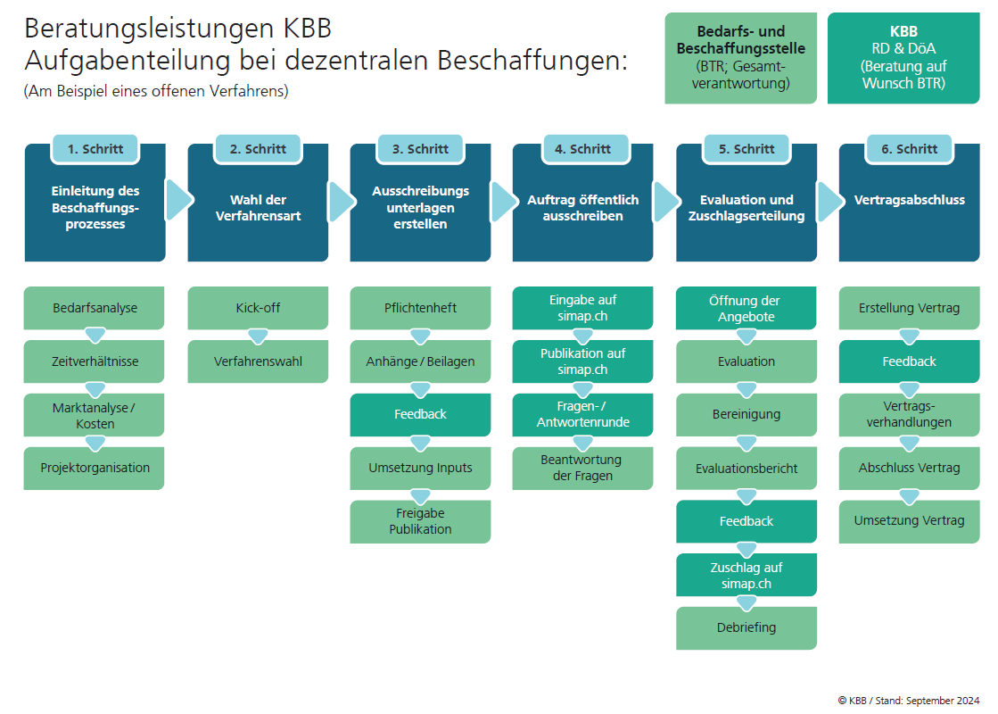 Das KBB stellt der öffentlichen Hand Mustervorlagen und sonstige Hilfsmittel zur rechtskonformen Durchführung von Waren- und Dienstleistungsbeschaffungen zur Verfügung.