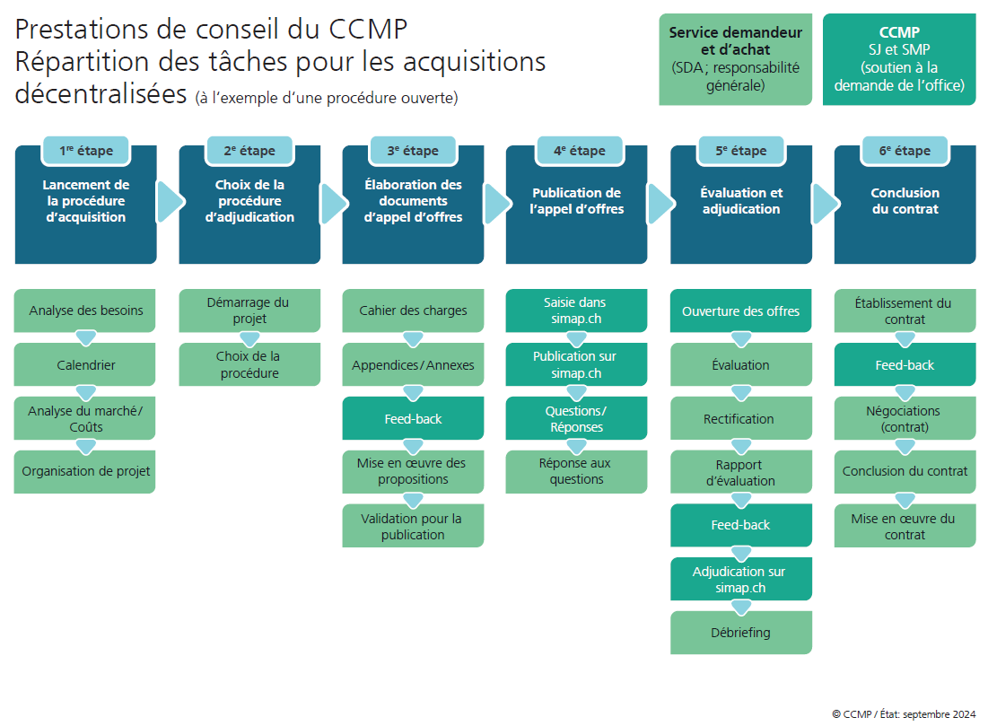 Vous trouverez ici une large sélection d’outils et de modèles pratiques, structurés selon les six étapes de la procédure d’adjudication. Ces ressources visent à vous aider à effectuer des acquisitions de manière efficace et juridiquement sûre.